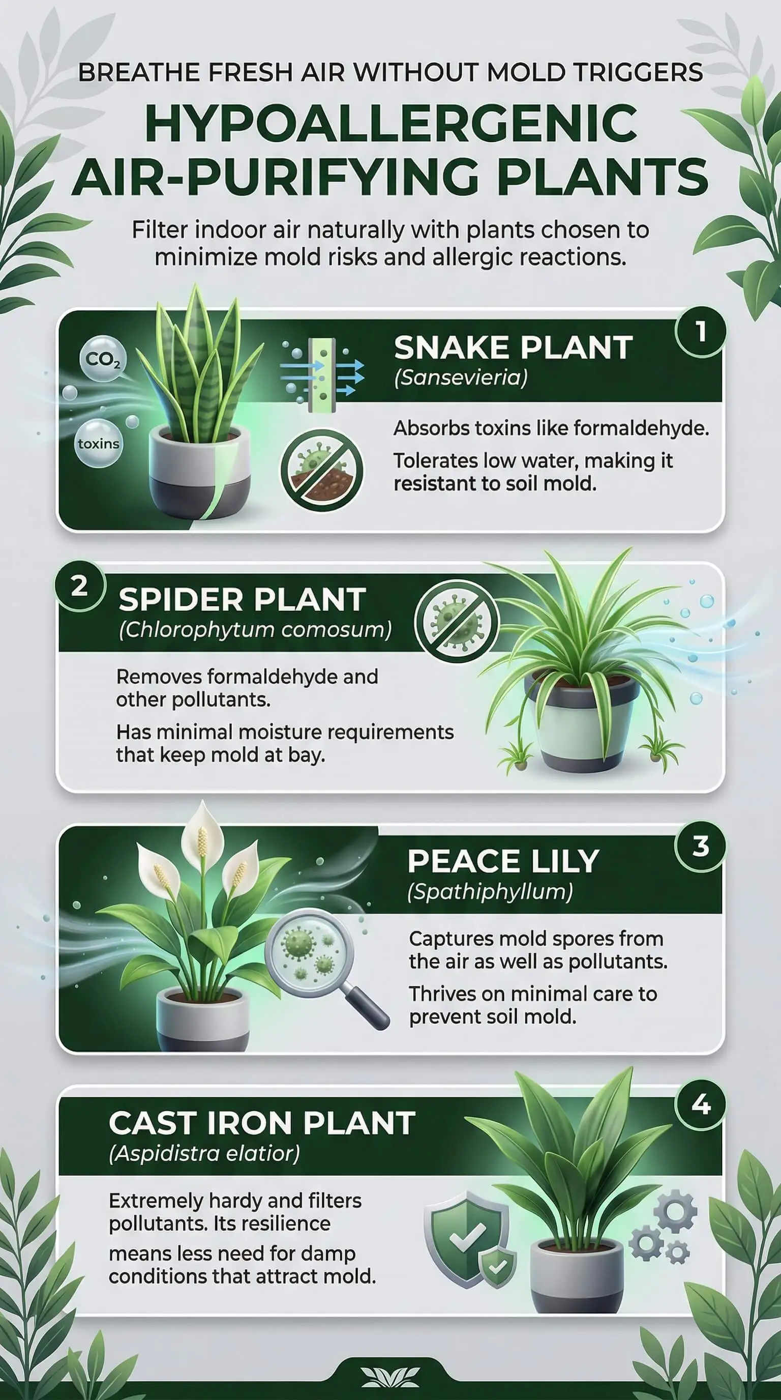 These plants are widely recognized for their air-improving properties and are low-risk for mold allergy sufferers because they tolerate dry soil between waterings and prefer well-draining growing conditions.